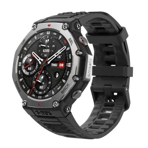 T-Rex 3 is a rugged outdoor smartwatch for outdoor and fitness athletes. Engineered to endure with over 3 weeks of battery life, it withstands temperatures from 158°F to -22°F, and waterproof to 328 feet. The face features a bright 2,000 nit screen to display GPS maps, workout data, and sleep recovery information. T-Rex 3 has best-in-class data privacy and GPS disablement for total privacy, and convenient AI guided voice control for easy adjusting of watch settings and speech-to-text message replies.